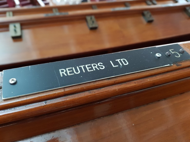 Seating in the upper gallery with table tops for reporters – all neatly labeled so that you know who’s writing for which publication.
