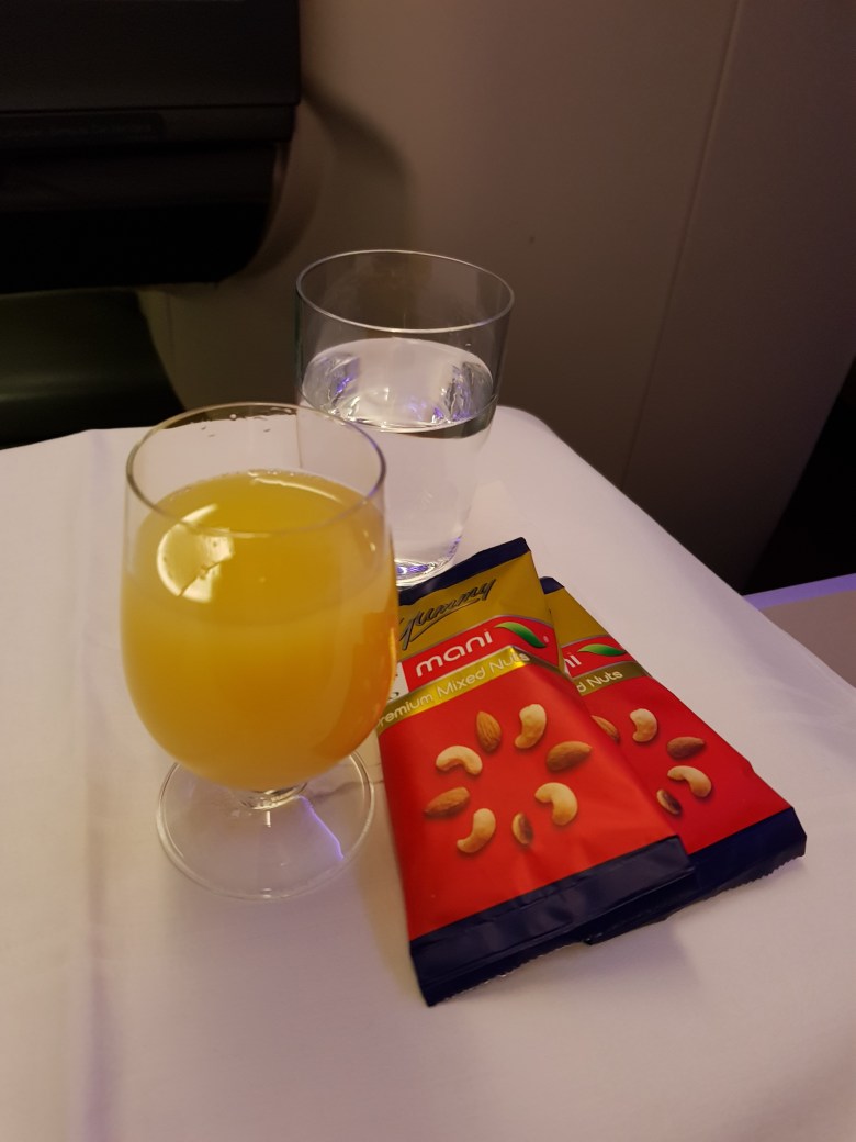 Right after the plane reached cruising altitude the first meal service commenced. First the crew brought out the standard fare of nuts and I requested again for juice. Much to the chagrin of the friendly flight crew who seemed rather amused that I didn’t want alcohol.