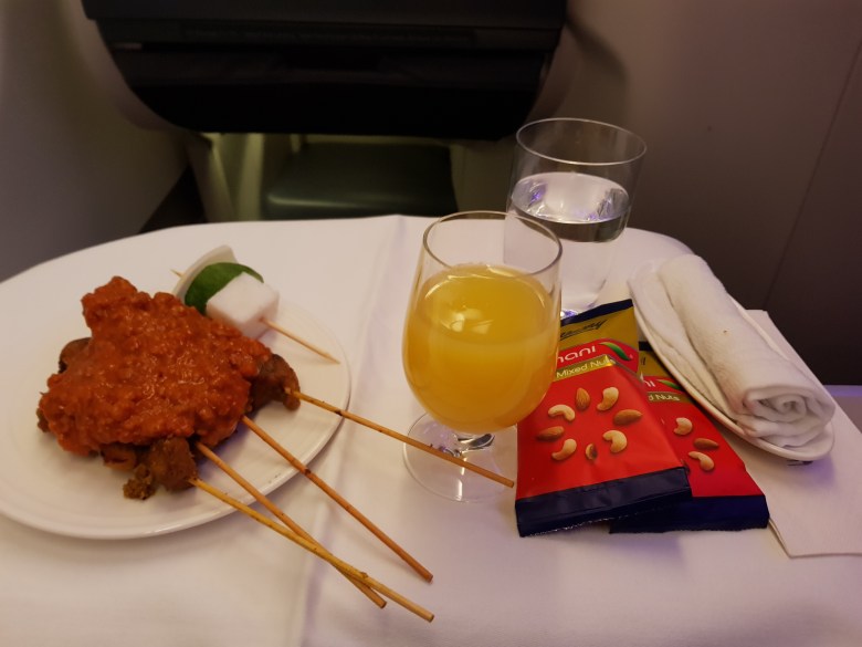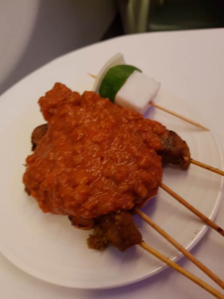 Although I’d already had a pre-flight meal at the lounge I won’t say no to the famed Malaysia Airlines satay. The satay was superb as I’ve heard it would be – tender moist chunks of chicken covered in peanut sauce.
